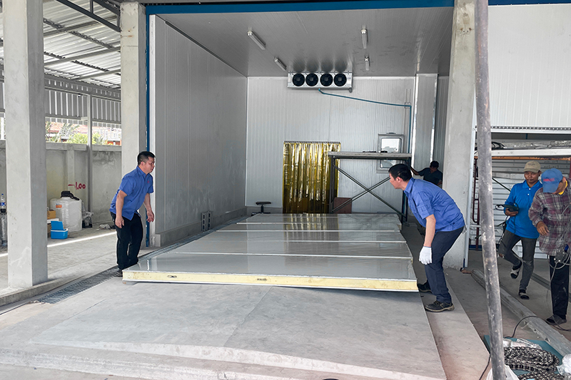 Constructed with stainless steel polyurethane sandwich panels, forming a well-insulated enclosure with a density of 42kg/m³, the storage unit measures 9150mm in length, 3850mm in width, and 3550mm in height and is equipped with low-temperature explosion-proof LED lighting for safe operation. The cold room door features a self-regulating heating system and a magnetic sensor switch, ensuring safe and reliable operation by keeping the door consistently functional. The floor structure is made of welded stainless steel, designed with built-in drainage channels on both sides and a slightly elevated center section to create a slope toward the drains. Four drainage outlets facilitate the rapid removal of condensation, reducing downtime and improving operational efficiency.